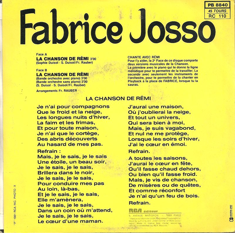 La chanson de Rémi par Fabrice Josso Le boulversant Rémi du feuilleton sans famille